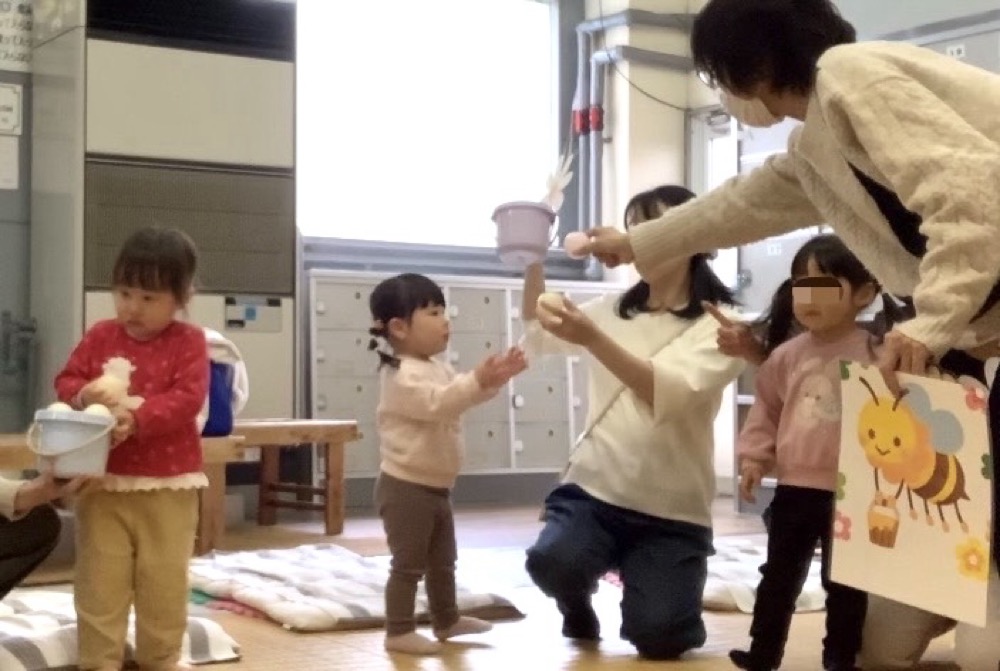 ハチさんになって「ぶーん!」と飛び回る動きはは、ベビーちゃん達にとって楽しい。